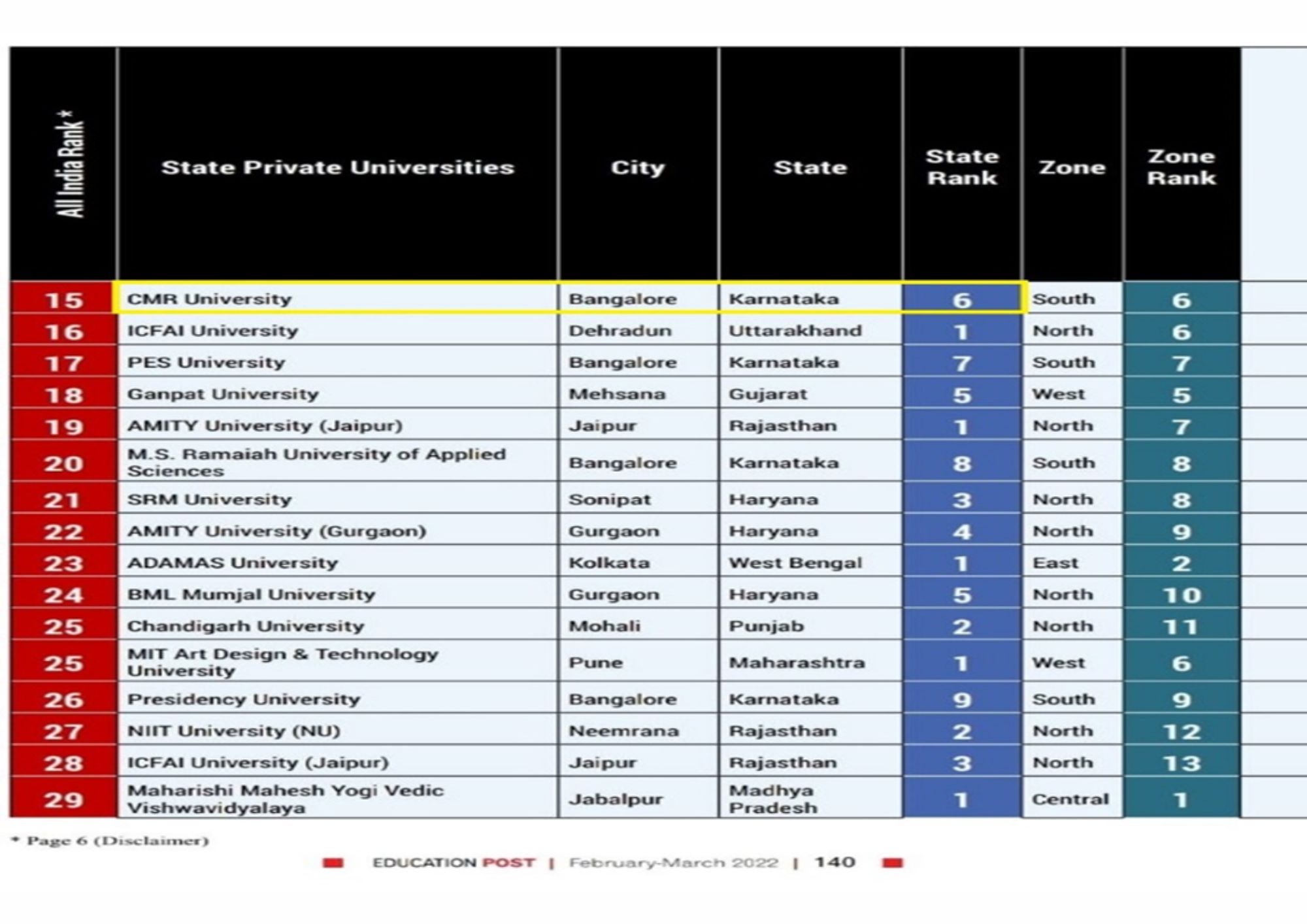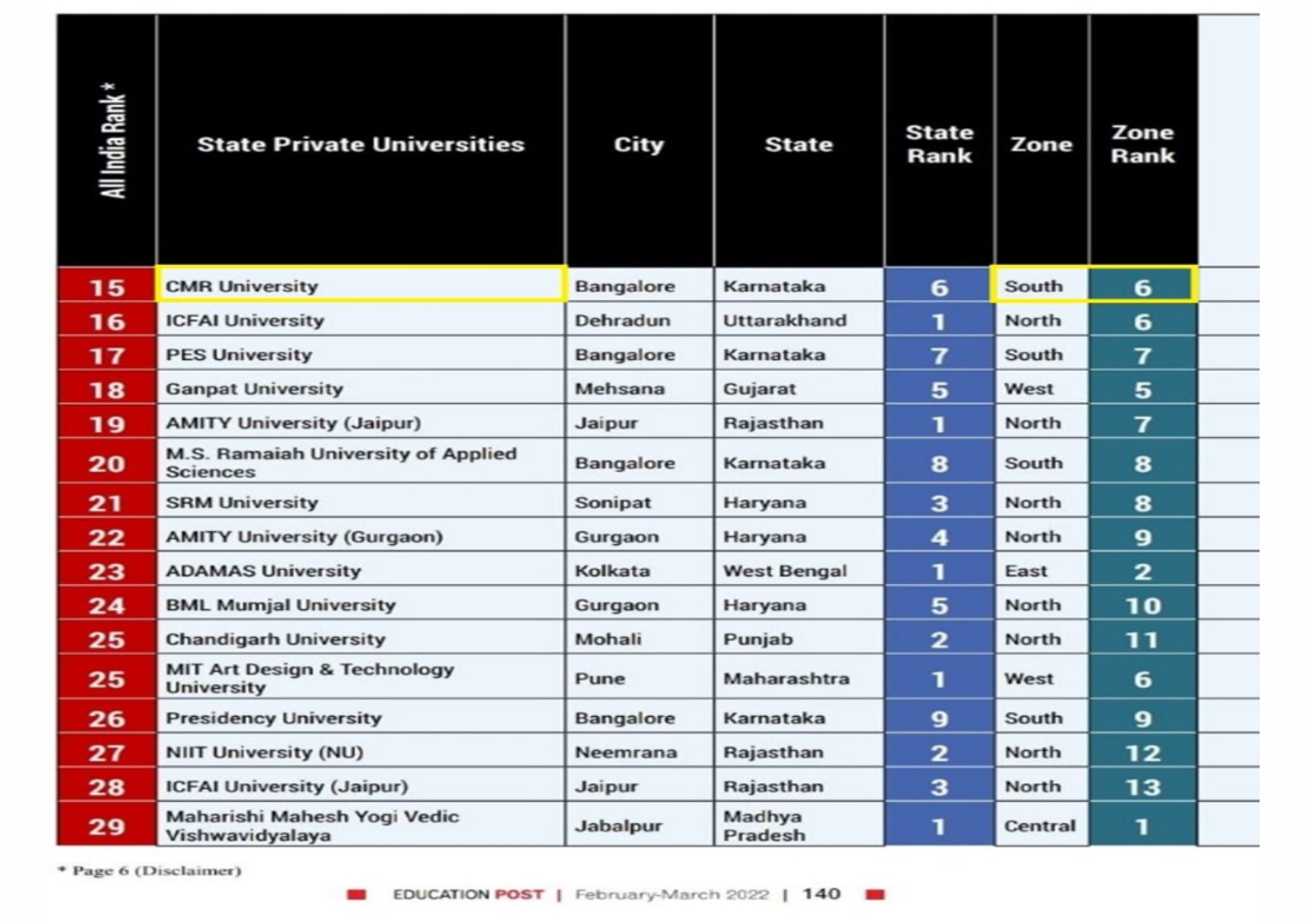 - School of Management,CMR University, Bengaluru. – BSchools South Zone, 62 Rank