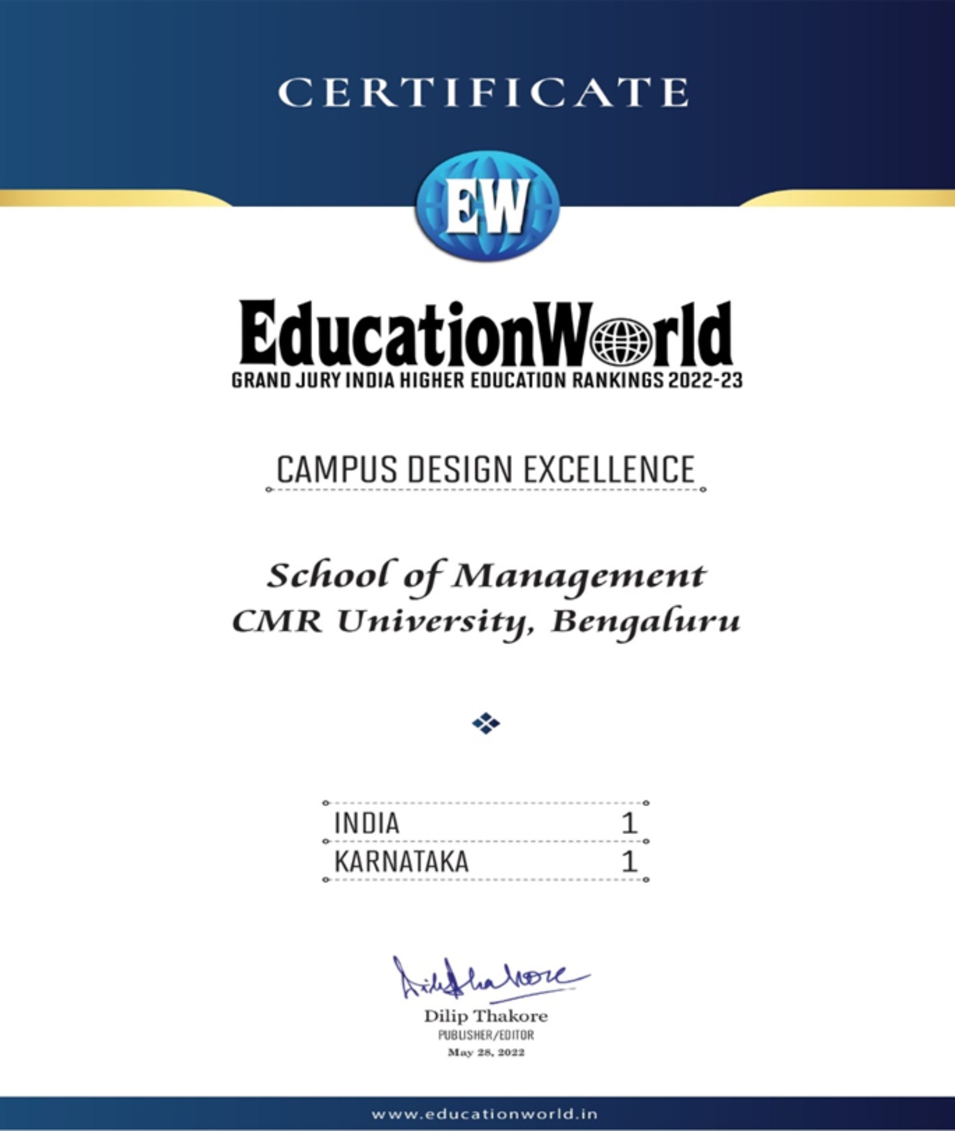 CMR University has been awarded as Best University in South India 2022 and Best University in south India Industry Interface 2022 from Center of Education Growth and Research for the year 2022 , Emerging University of the Year 2022 from Association of Management Development Institute of South India for the year 2022.Certificate Details