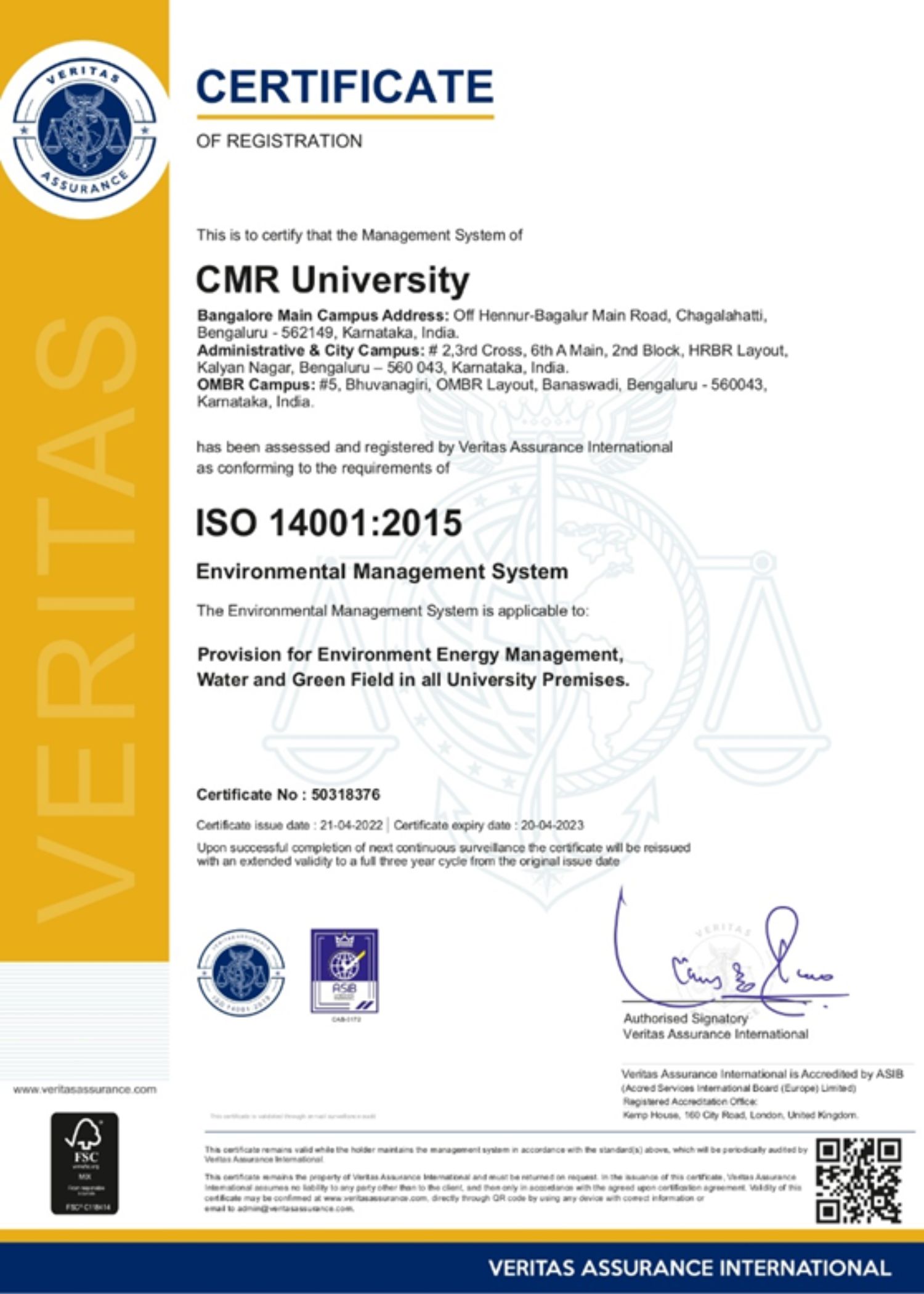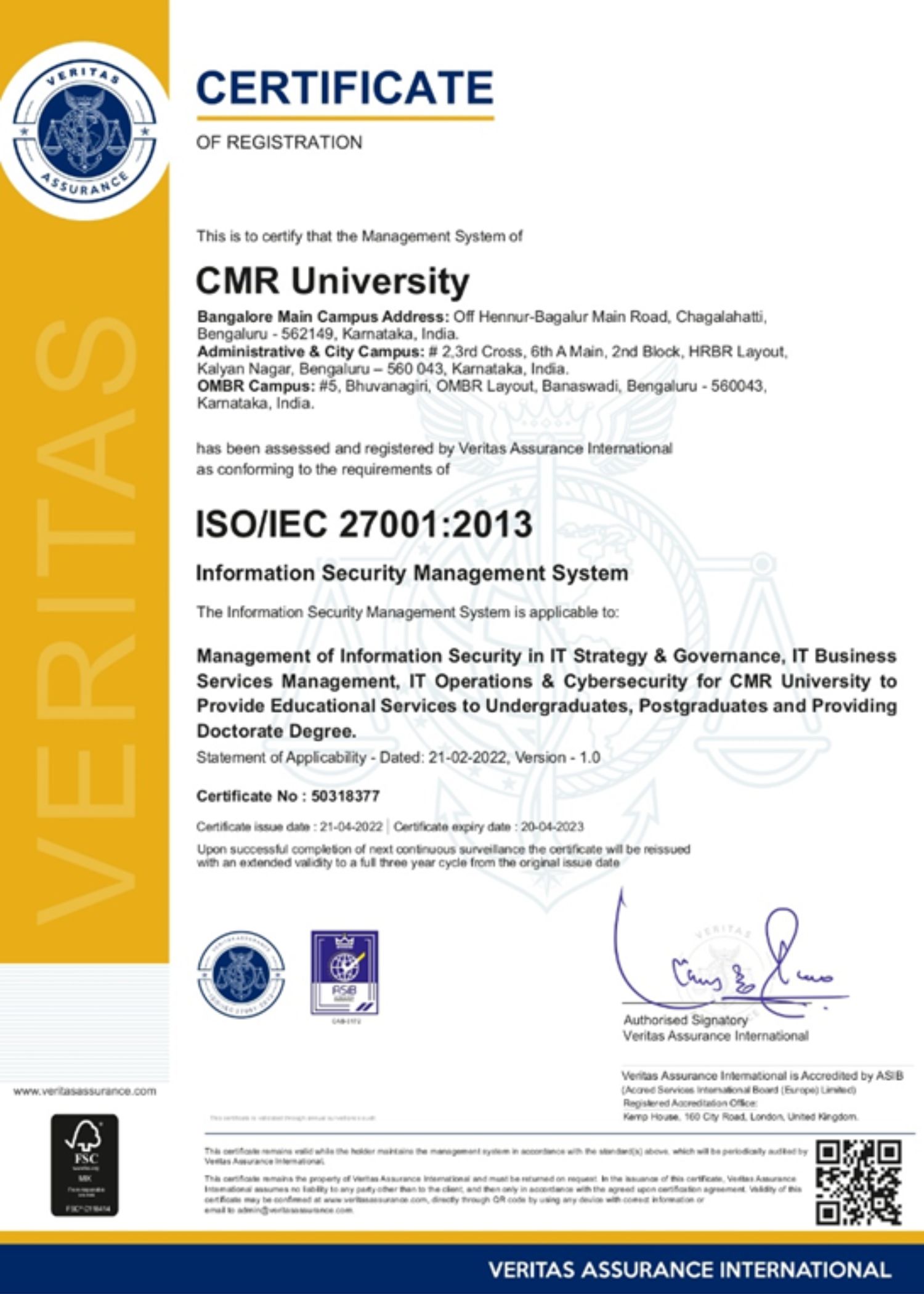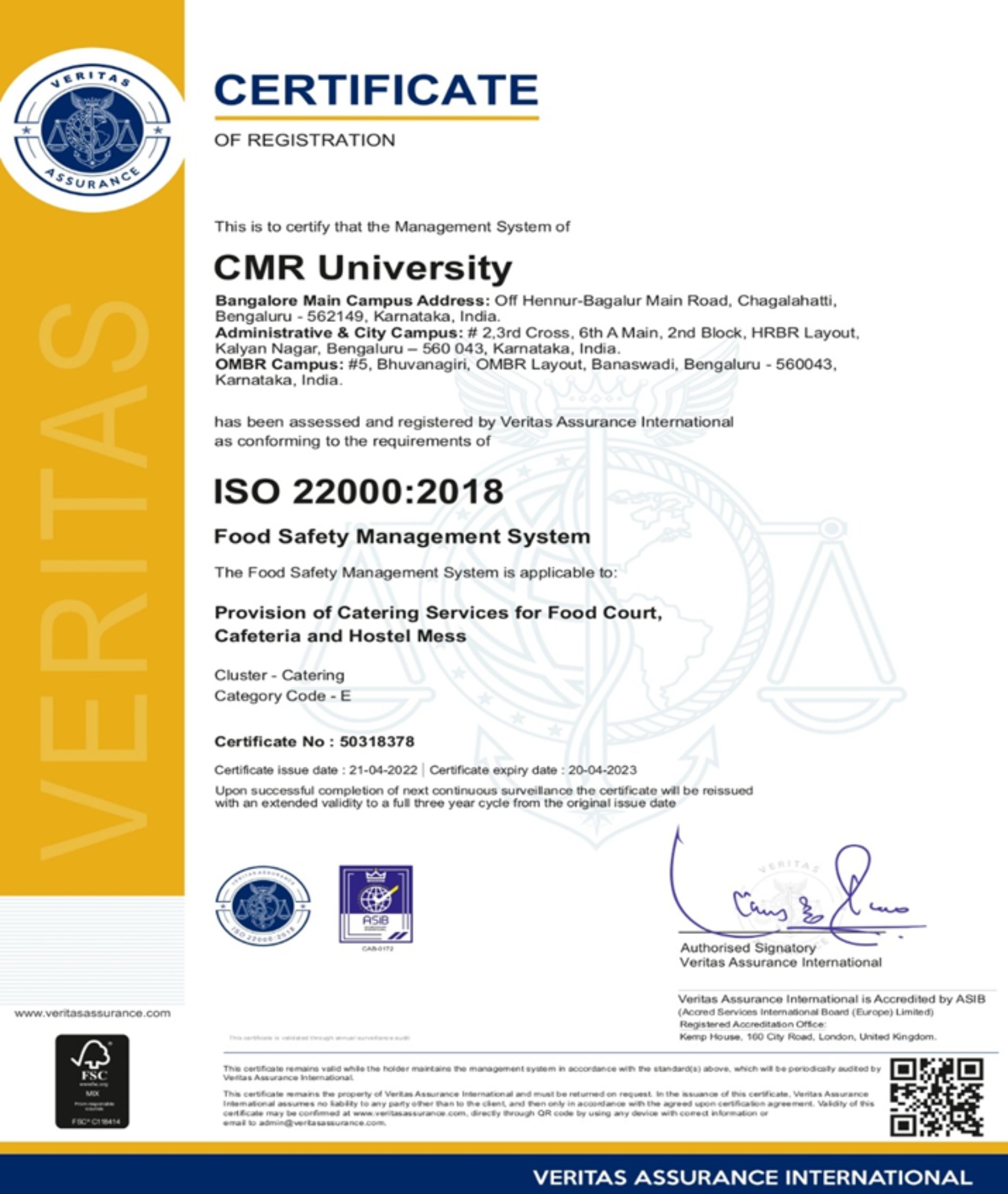 CMR University has received certification for Perfect Work Place for women Certification and Five Star Place to Work Certification from Artificial Intelligence Registration and Certification Limited for the year 2022, ISO Certified 22000-2018 Food Safety Management, ISO 9001-2015 Quality Management System Certification, ISO / IEC 27001: 2013 Information Security Management System Certification, ISO 14001: 2015 Environment Management System Certification from Veritas Assurance International, Kemp House, 160 City Road, London, the United Kingdom for the year 2022, International Accreditation till the Year 2027(Full Accreditation) from International Accreditation Organization, 10685-B, Hazelhurst Dr. # 11524, Huston, TX 77043, USA, for the year 2022, Workplace Assessment for Safety and Hygiene (WASH)- Certification from Quality Council of India, IR Class Systems and Solutions Pvt Ltd for the year 2022.