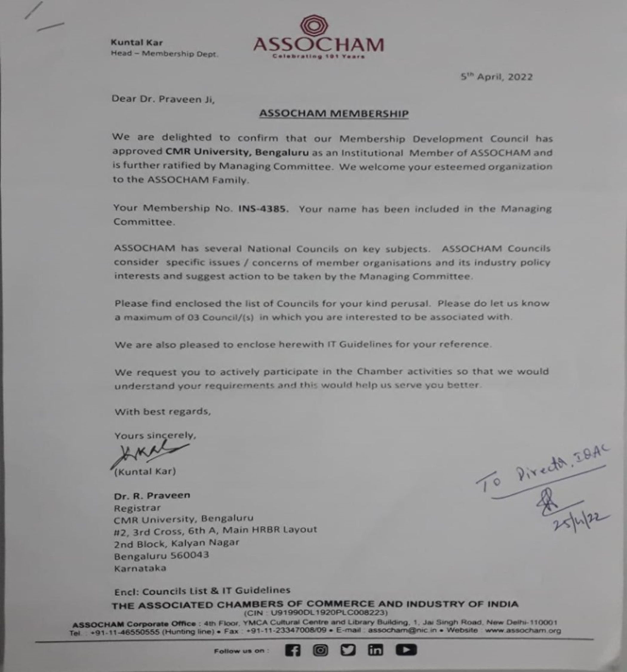 - The Associated Chambers of Commerce and Industry of India – Professional Institutional Membership from The Associated Chambers of Commerce and Industry of India
