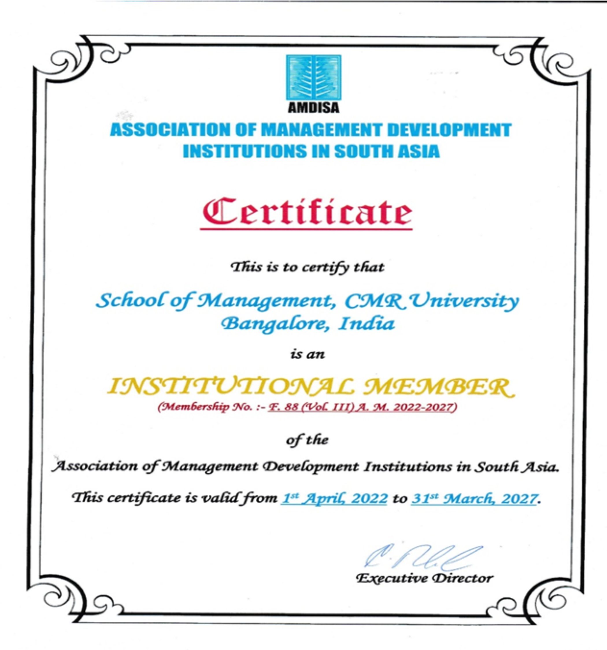 CMR University has Membership with The Associated Chambers of Commerce and Industry of India – Professional Institutional Membership, The Institution of Electronics and Telecommunication Engineers (IETE) Institutional Membership, Association of Management Development Institutions in South Asia, Professional University Membership – Computer Society of India (CSI), Professional University Membership – The Institution of Engineers (India), IEI, Professional University Membership – Operational Research Society of India (ORSI), Professional University Membership – INDIAN SOCIETY FOR TECHNICAL EDUCATION (ISTE)