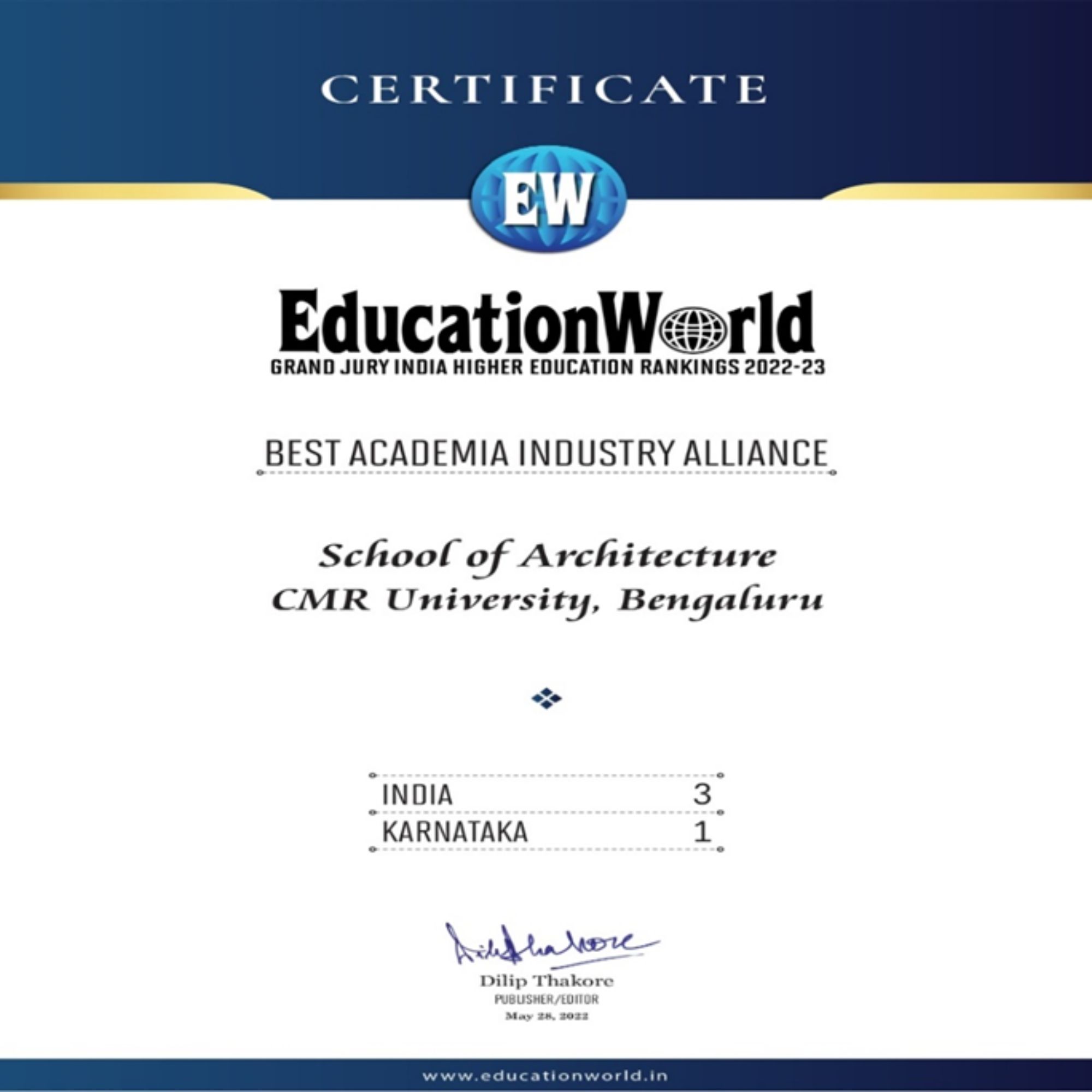 - Best Academia Industry Alliance , School of Architecture, CMRU, Bangalore