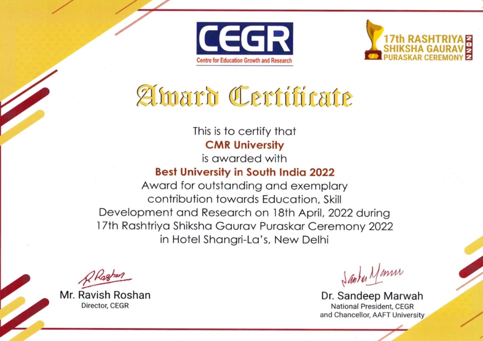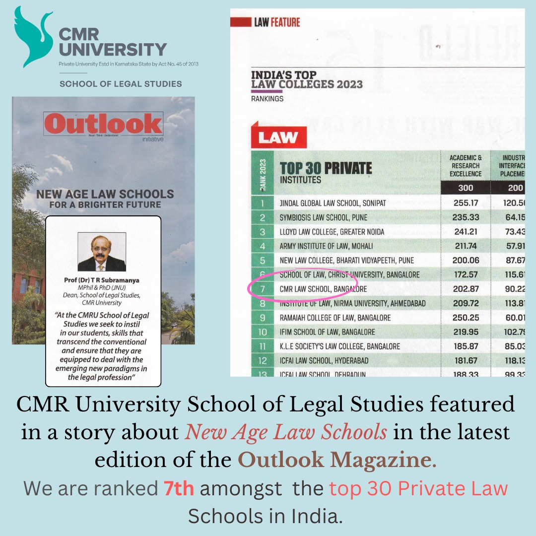 CMR University has been awarded as Best University in South India 2022 and Best University in south India Industry Interface 2022 from Center of Education Growth and Research for the year 2022 , Emerging University of the Year 2022 from Association of Management Development Institute of South India for the year 2022.- School of Legal Studies is ranked 7th among India’s Top Law Colleges 2023 – Private Colleges by Outlook Magazine