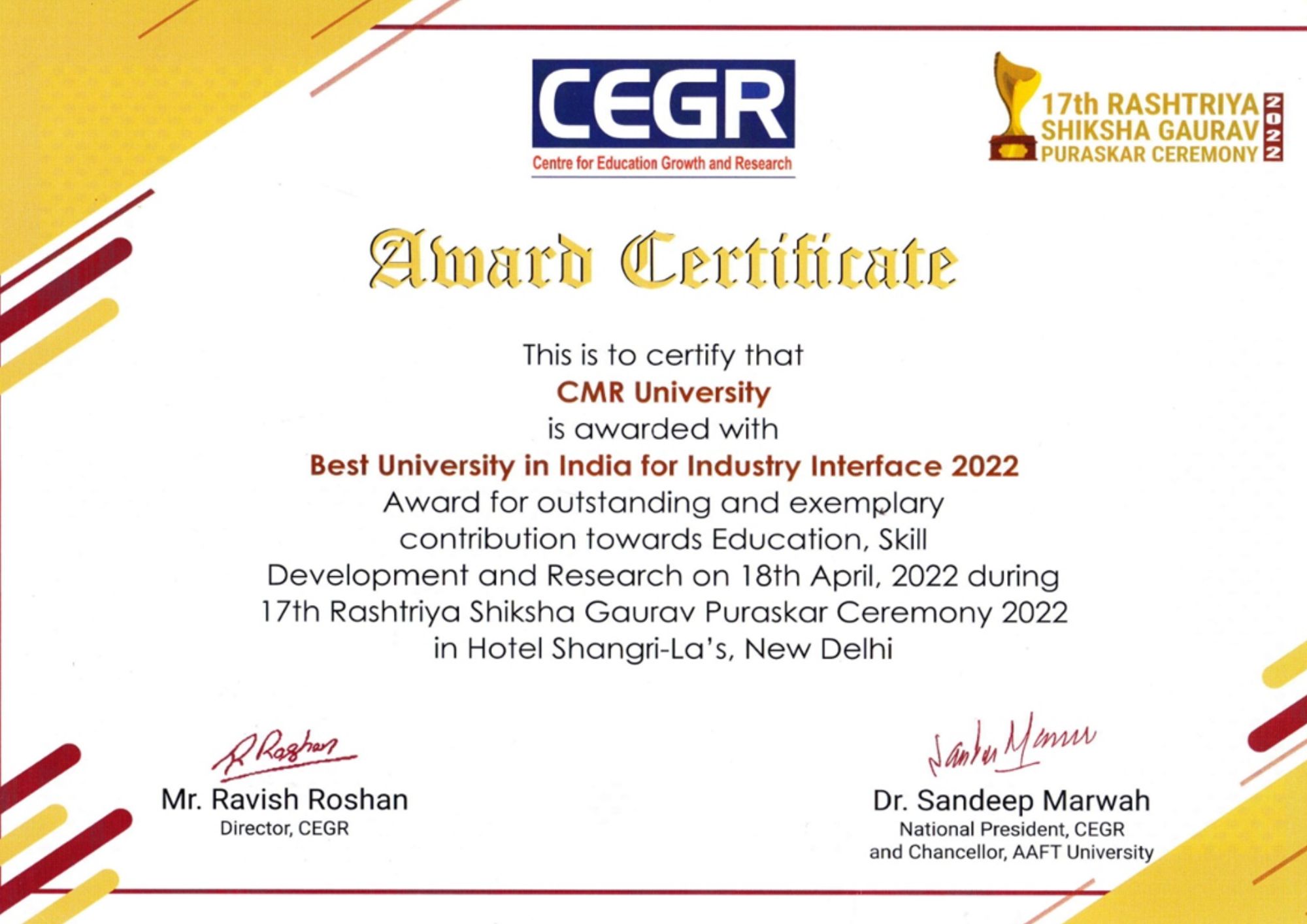 - CMR University has been selected as one of the winners