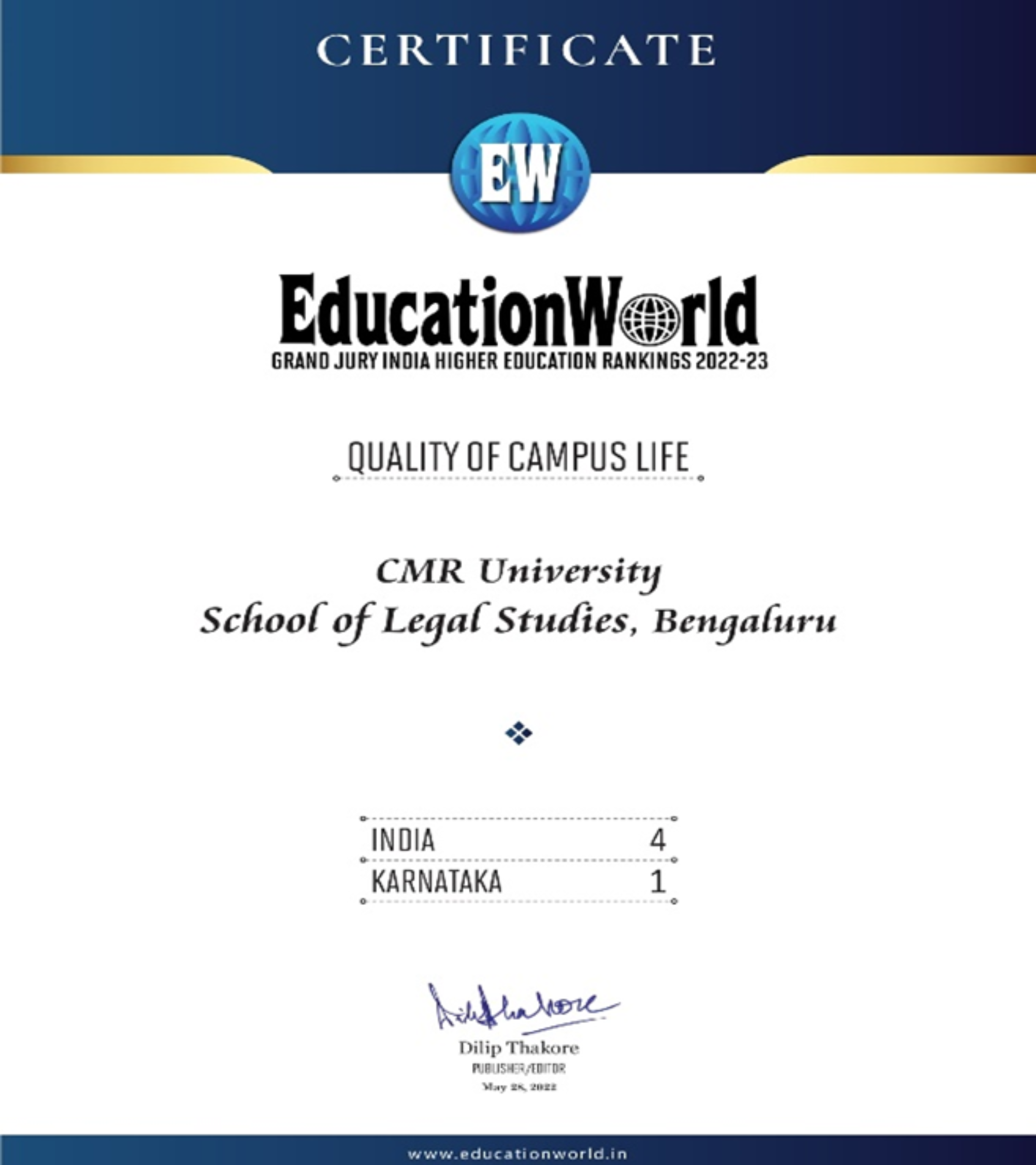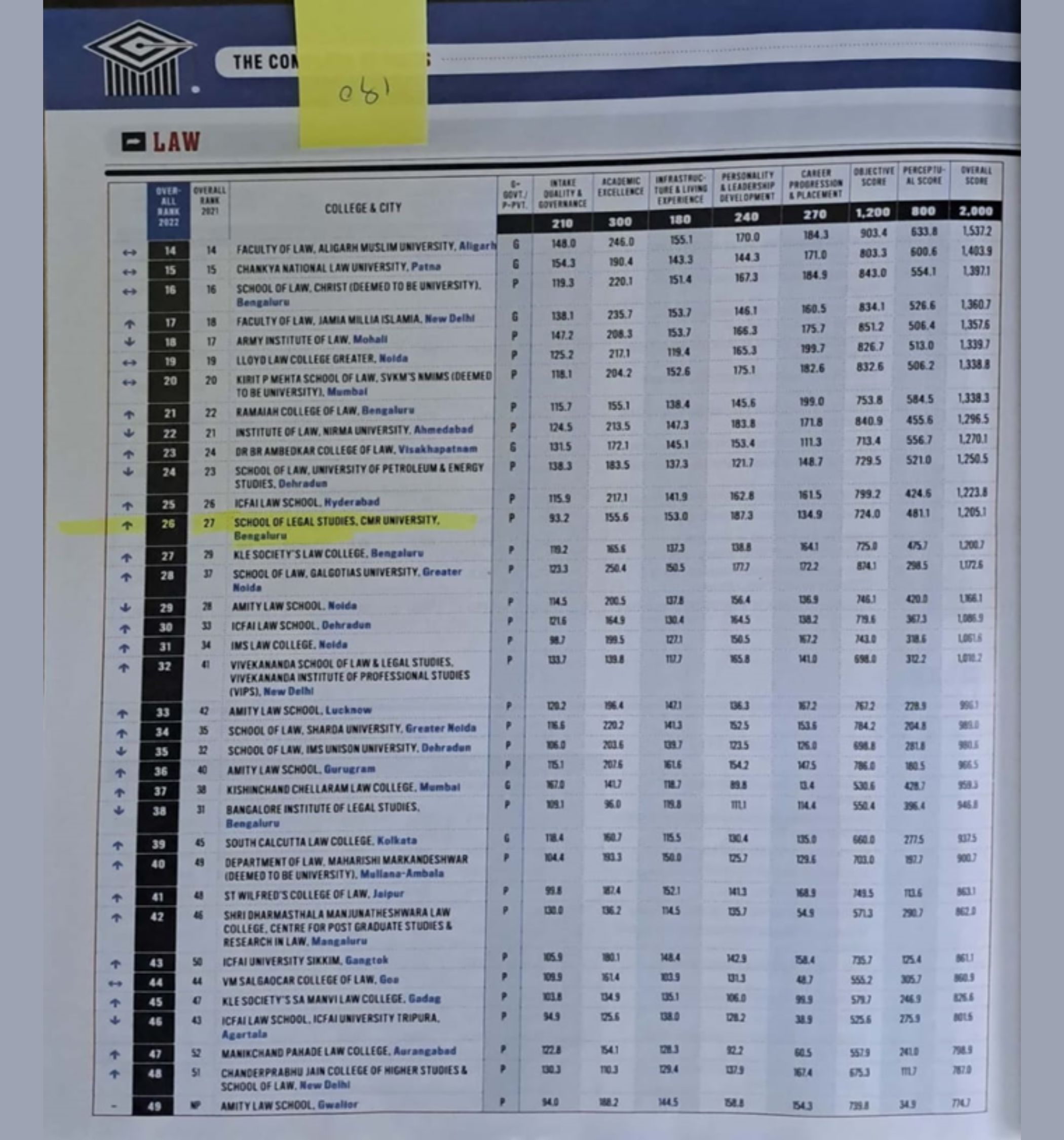 - CMR University School of Legal Studies Bengaluru Ranks 27 All India.