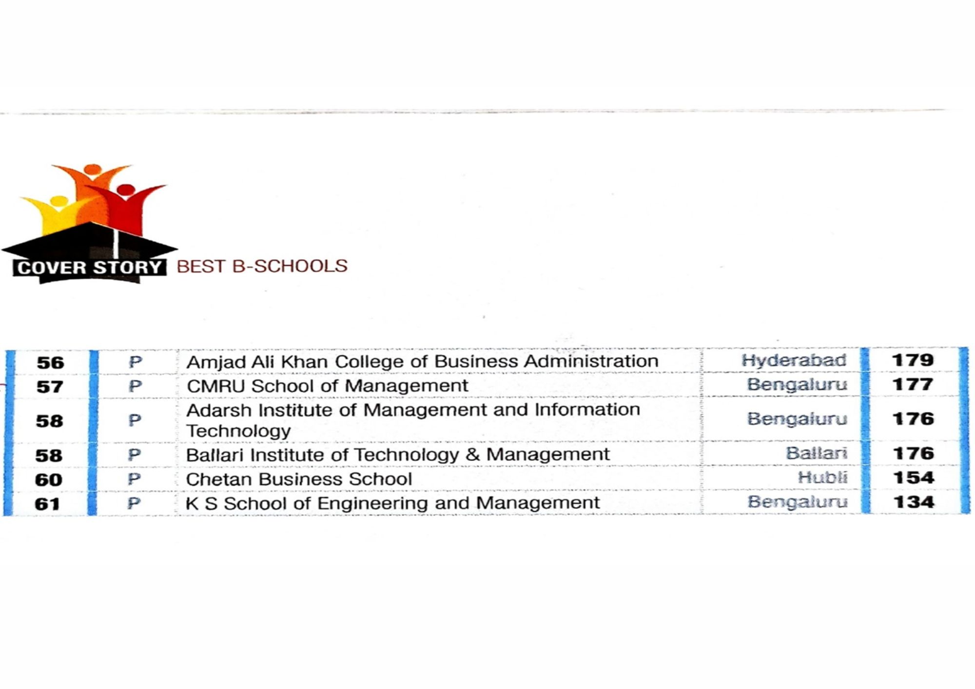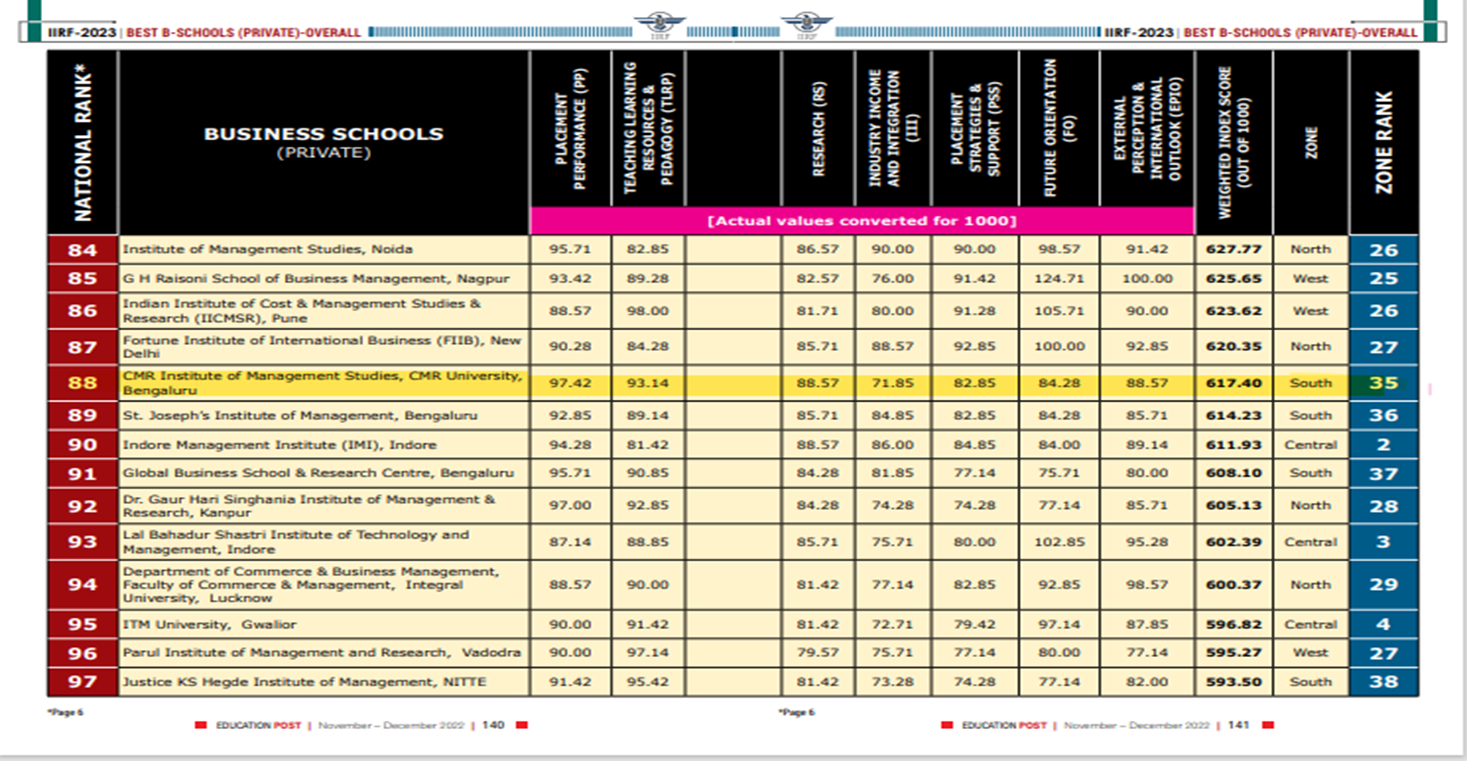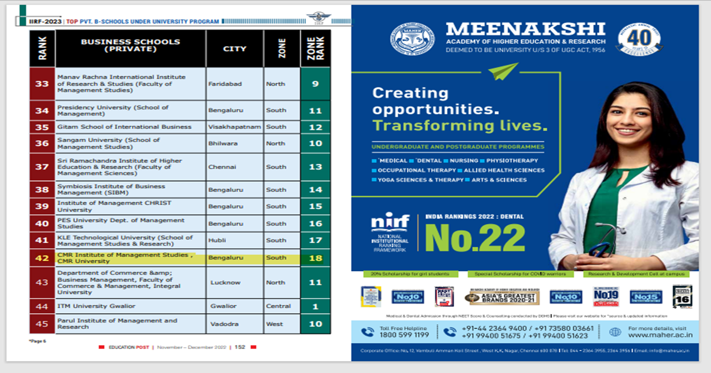 - School of Management,CMR University, Bengaluru. – BSchools South Zone, 62 Rank