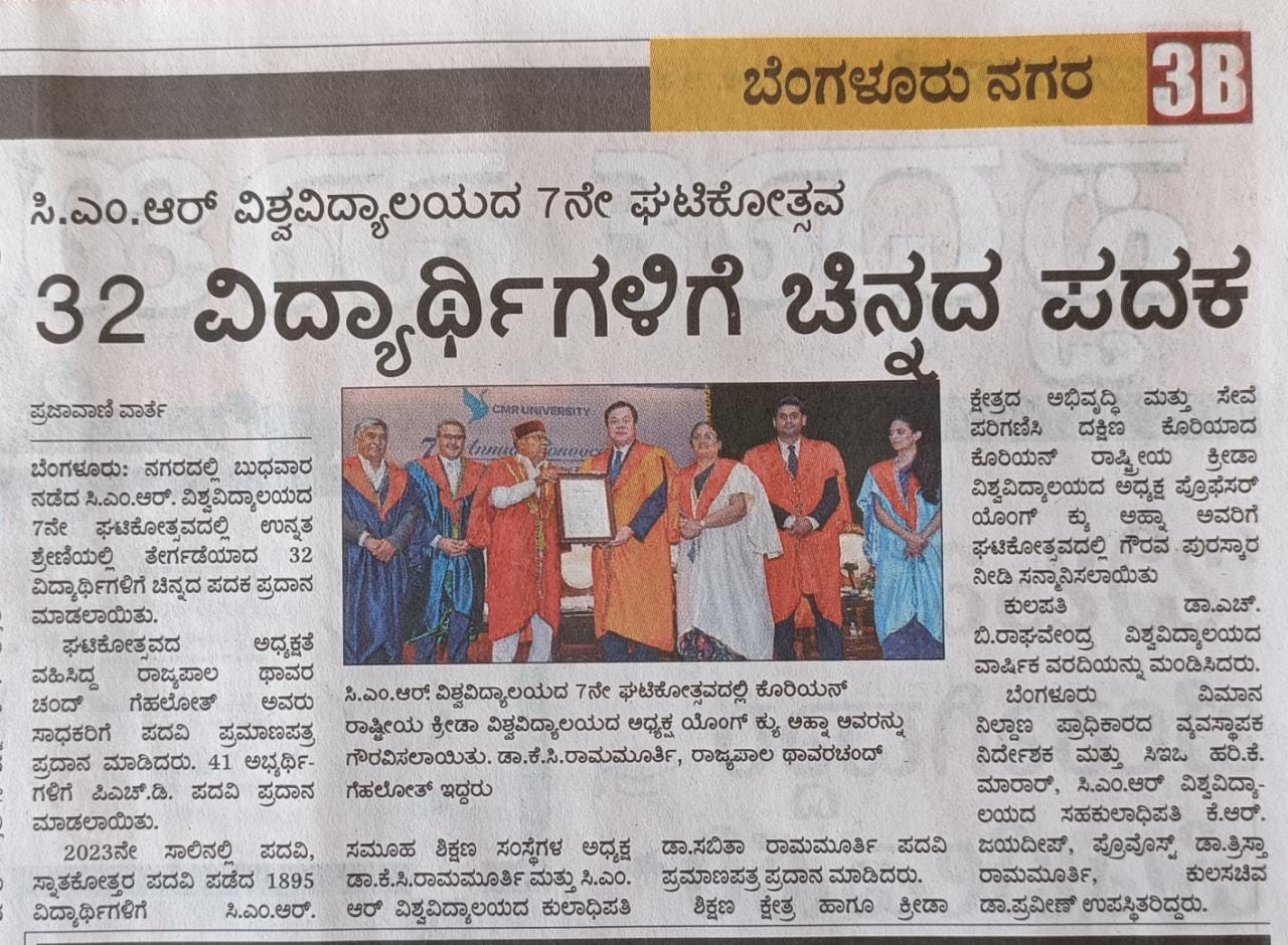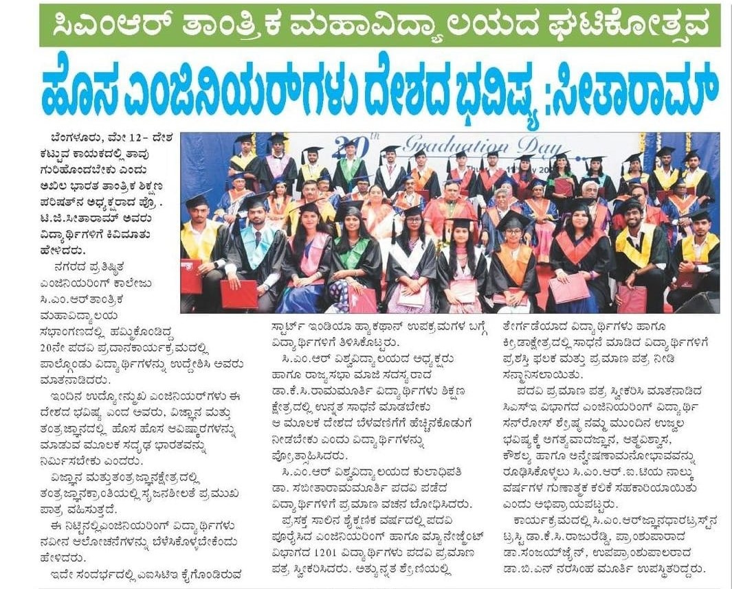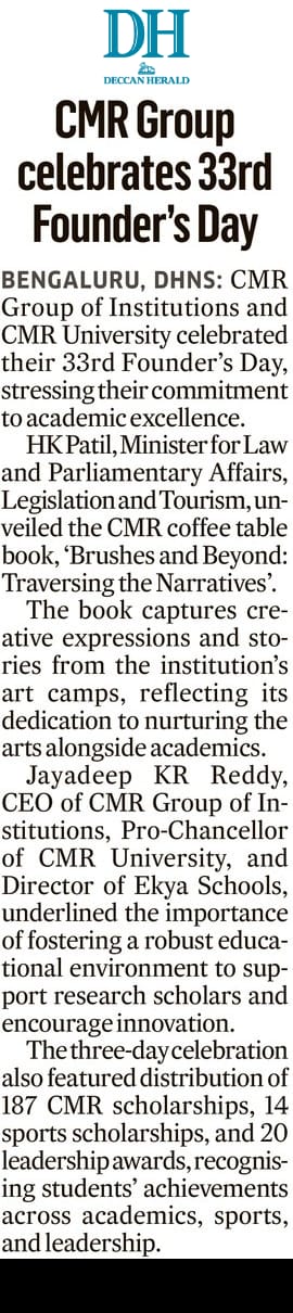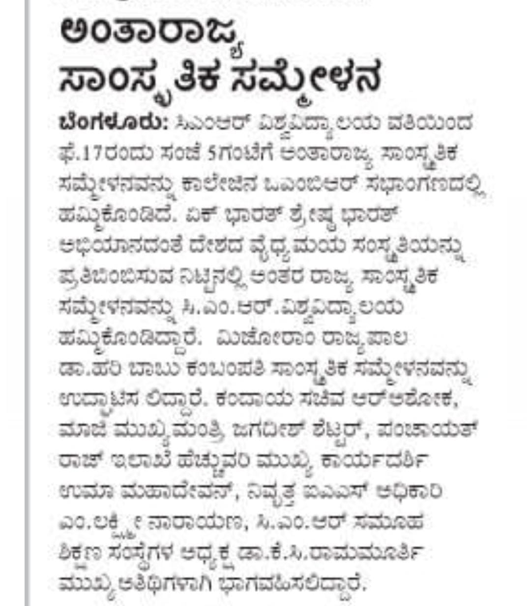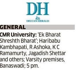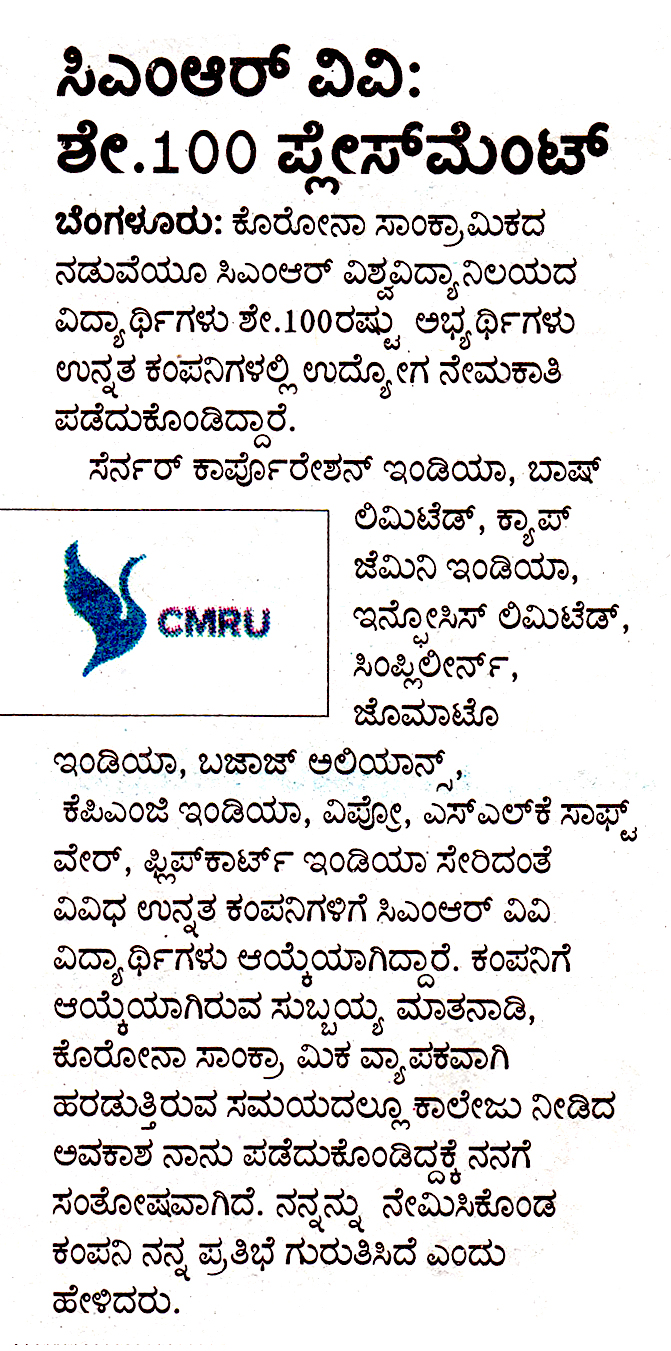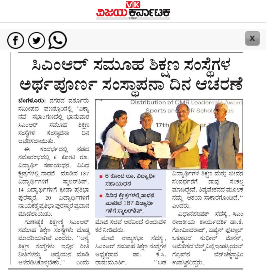 Featured in Bangalore city news |Aryavarth | Xpress Alert | Vartha Bharathi | Udayavani | Udayavahini | Udayakala | Twitter- CMRU | TVA News | Shiksha | Sanjevani | Sanjevani, pg 03 | sanjevani CMRU Online | Sanje Samaya | Samyuktha Karnataka | Samachar Parivartan | Right Info | Prajavni | news 8 | Madhyamam Listing | Hosadigantha | Higher Education Digest-CMRU | Education World | Eanadu | DD News | CMR Vijayavani | Bangalore Dhinamani | Bangalore Dhinamani