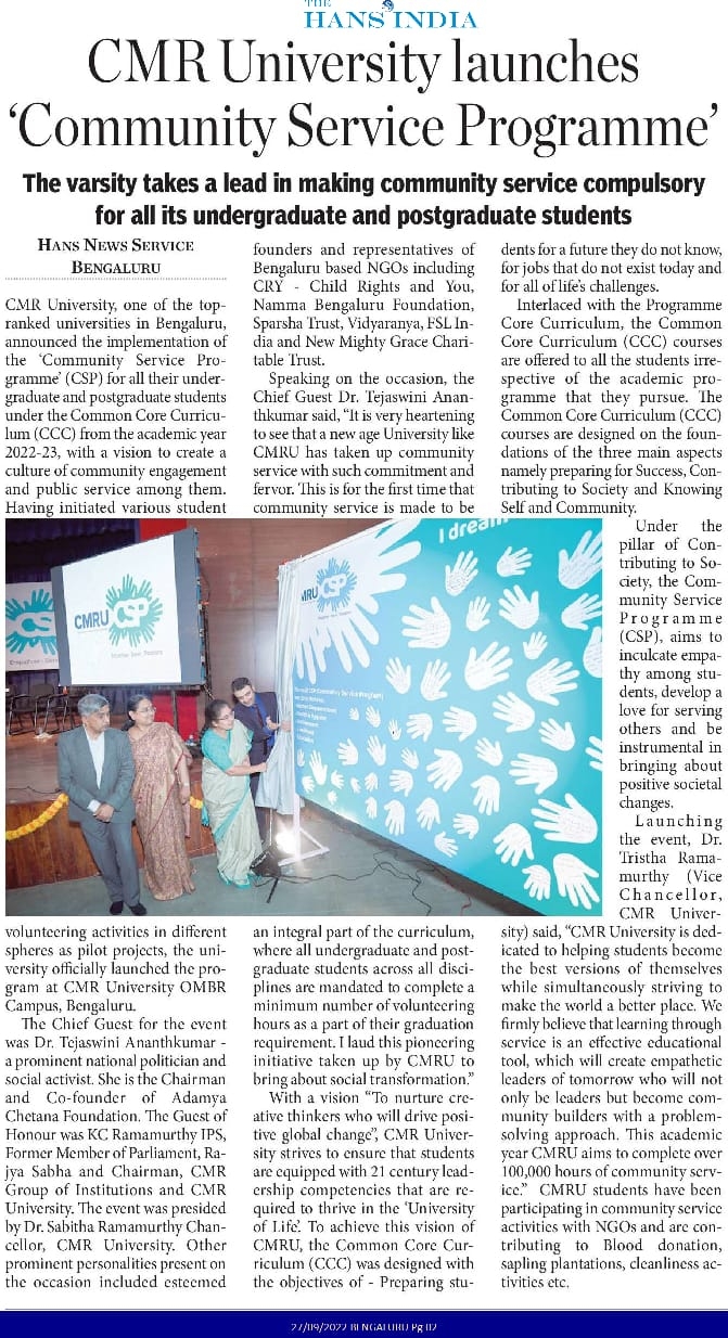 CSP Launch – CMR University Introduces ‘Community Service Programme’ as Mandatory Part of its Core Curriculum for Students to Partake in Social Responsibility Projects.