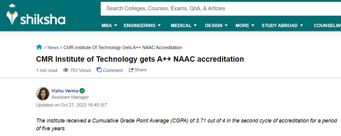CMR Institute of Technology conferred with A++ Accreditation by NAAC