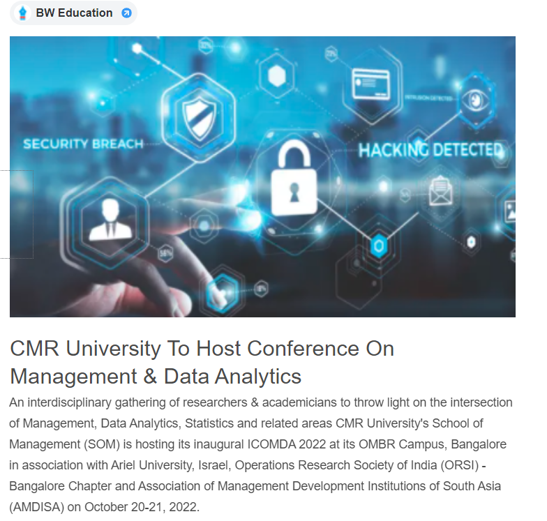 CMR University’s specialized Centre for Business Analytics was inaugurated by Dr Arvind Kumar – Vice President – R&D, Optym on 21 January 2022, and is one of the 6 Centres of Excellence of the University’s School of Management.