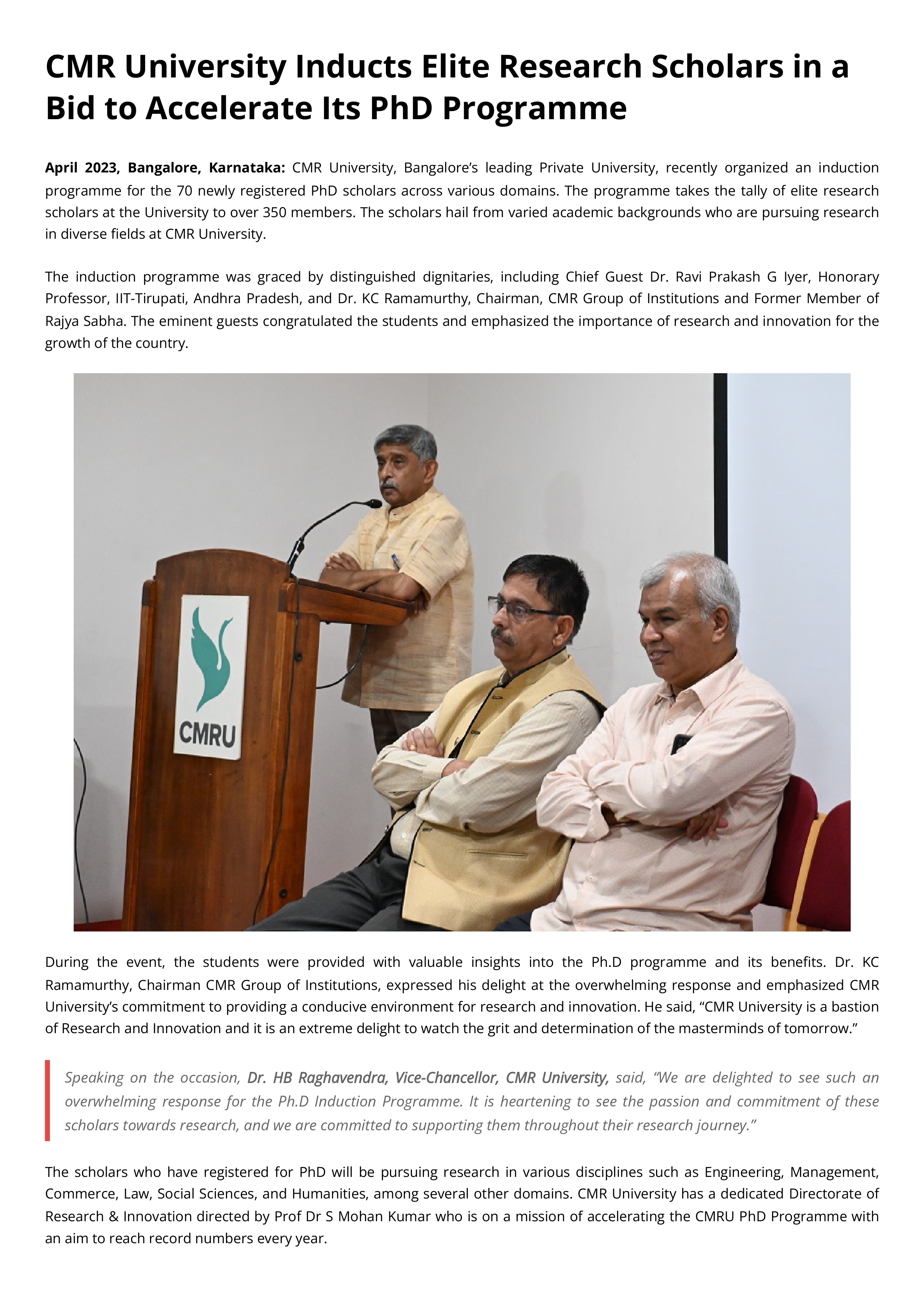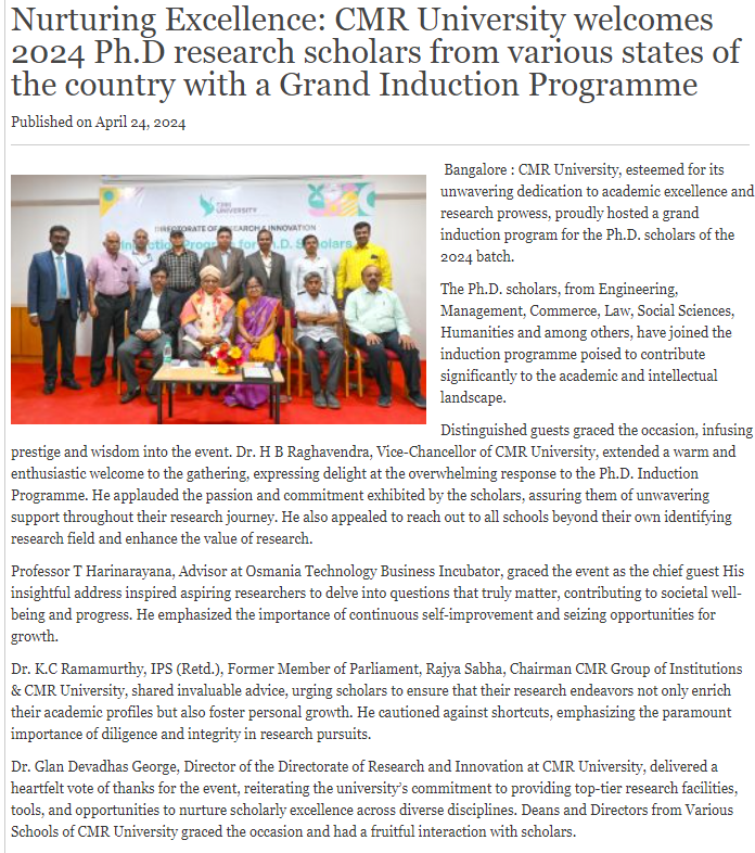 CMR University Welcomes New Ph.D. Scholars with Grand Induction Program