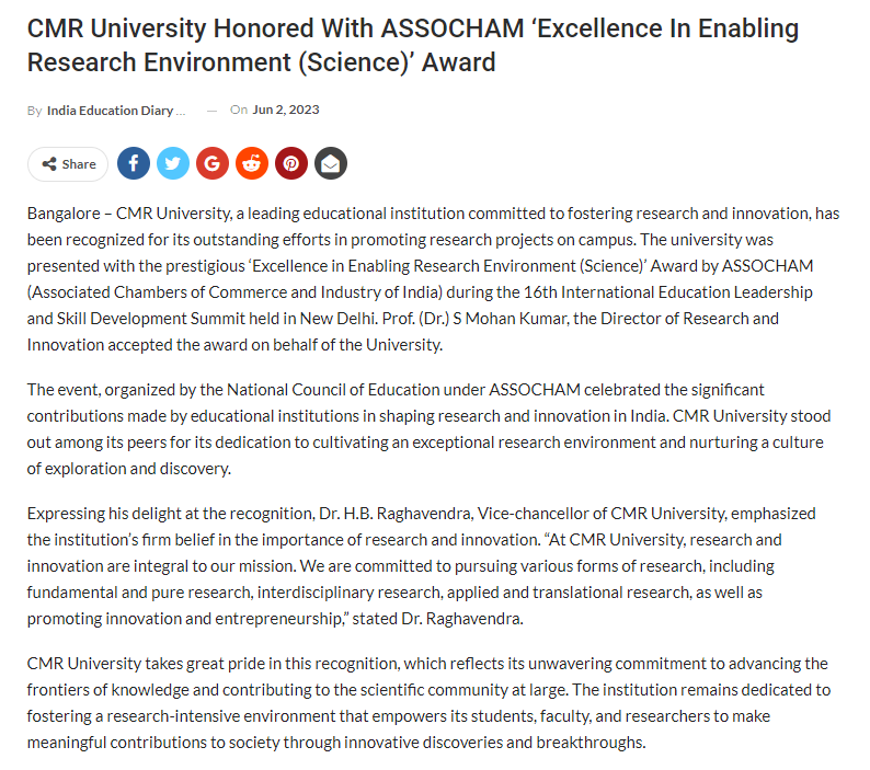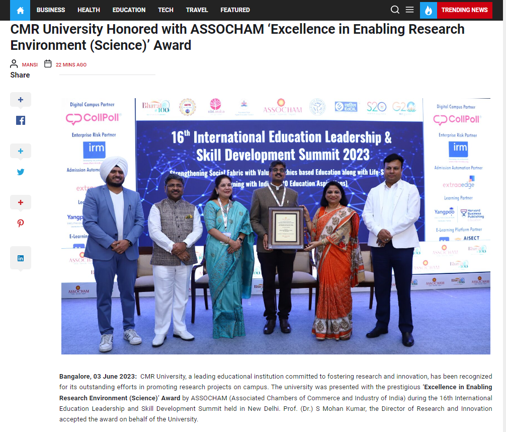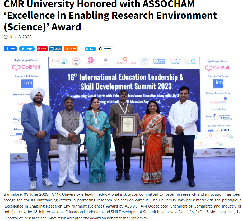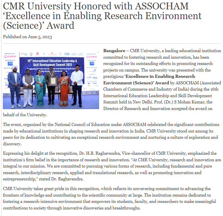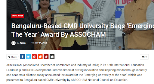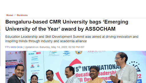 CMR University Bengaluru awarded Emerging University Of The Year by ASSOCHAM, New Delhi
