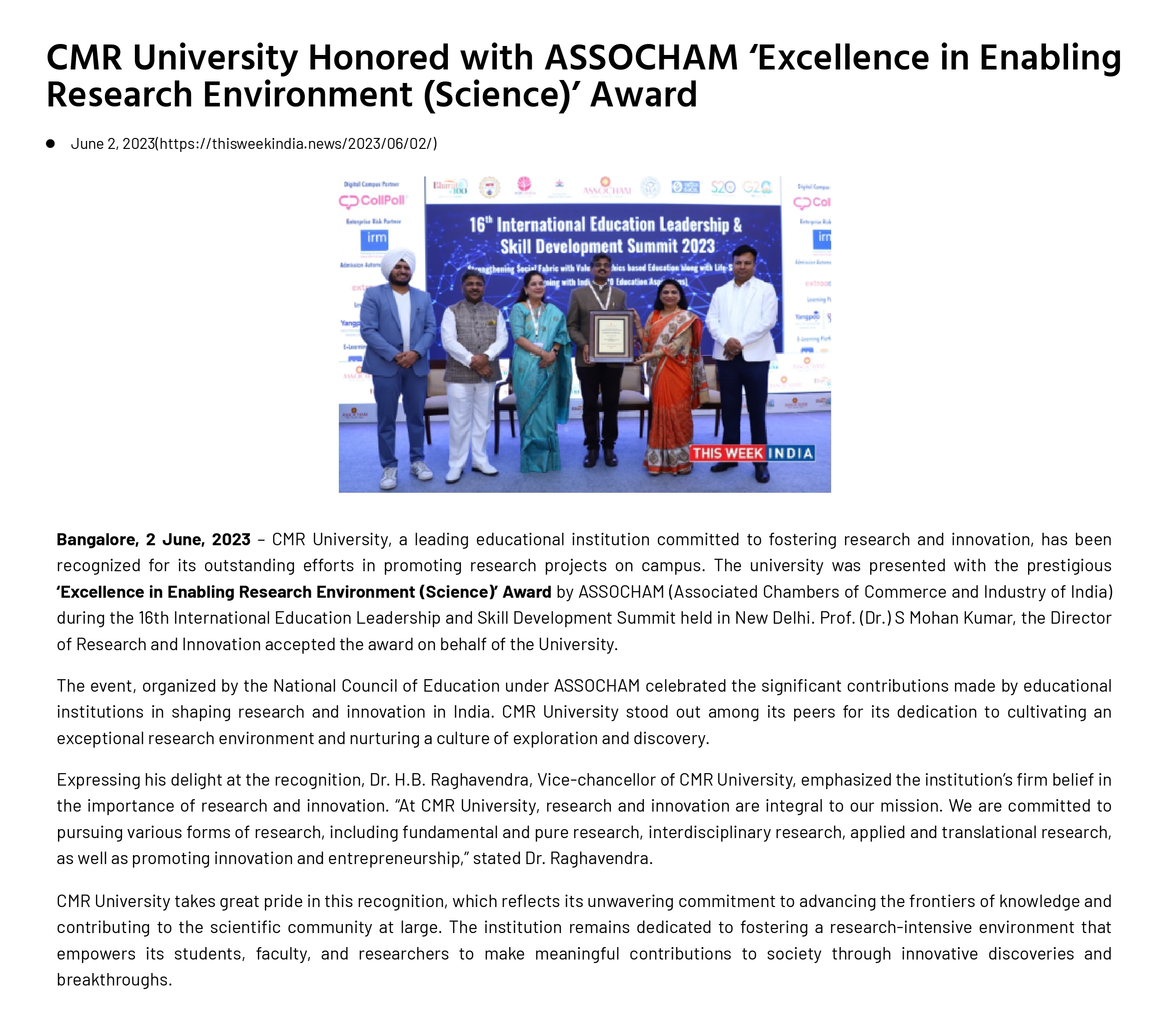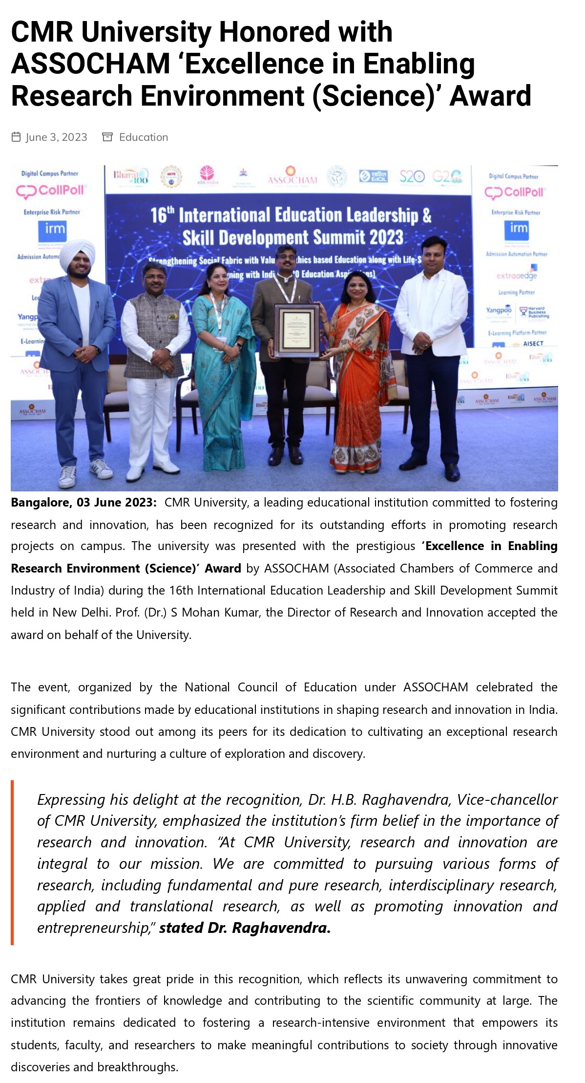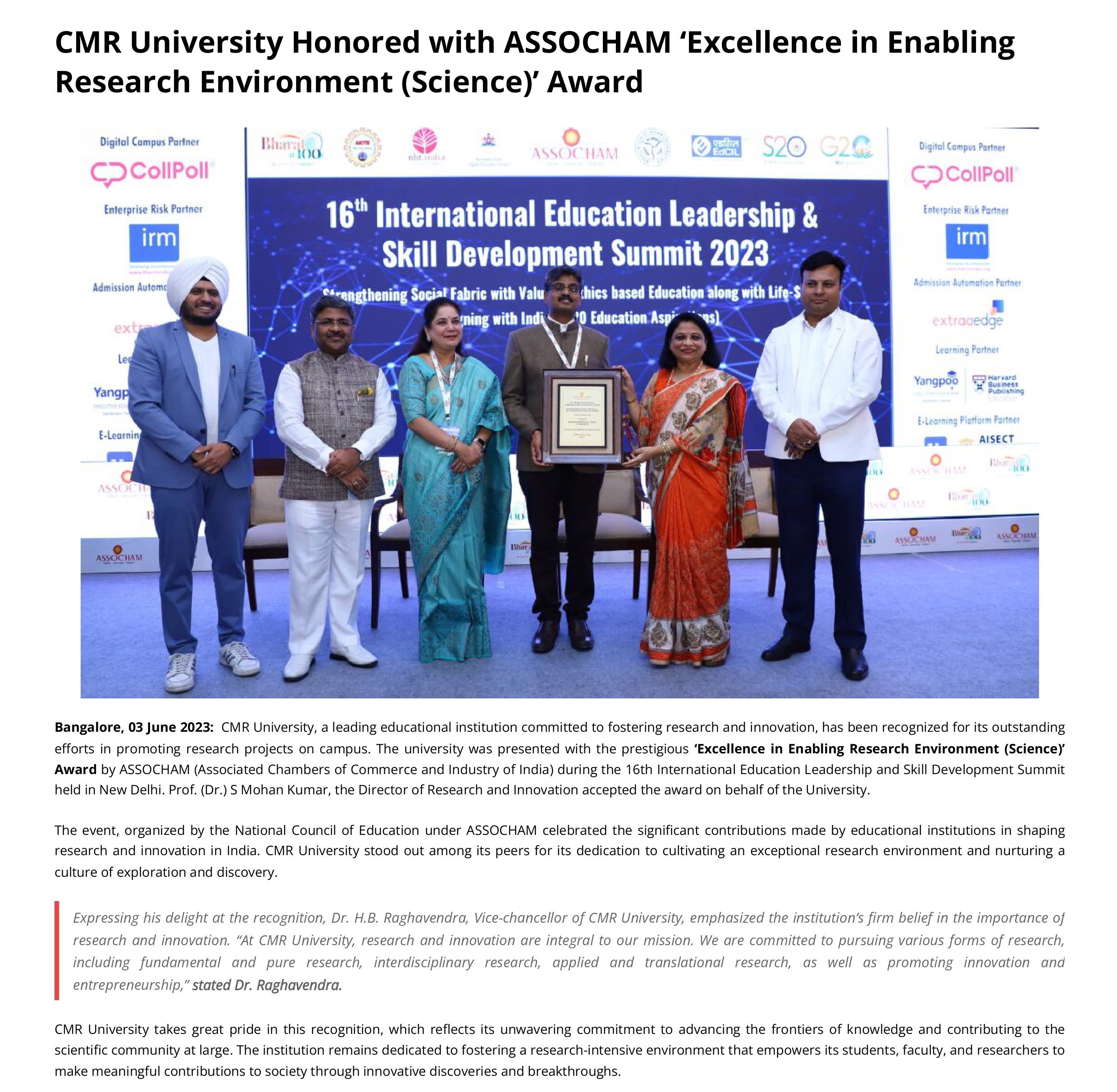 CMR University Bengaluru awarded Emerging University Of The Year by ASSOCHAM, New Delhi