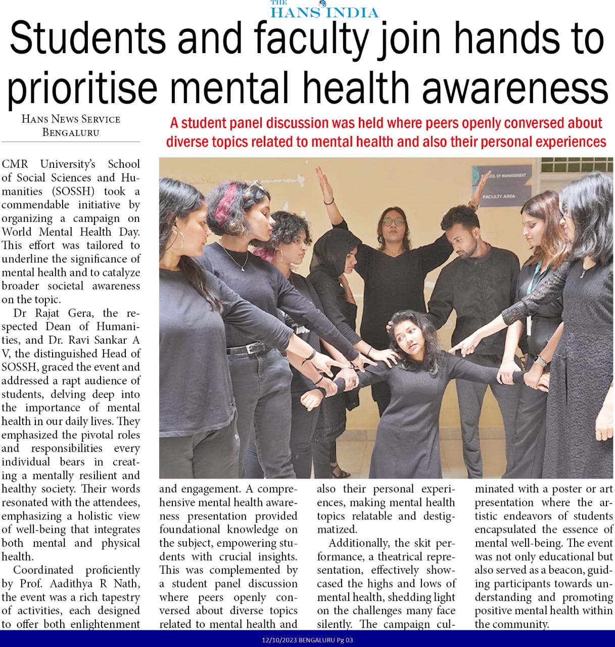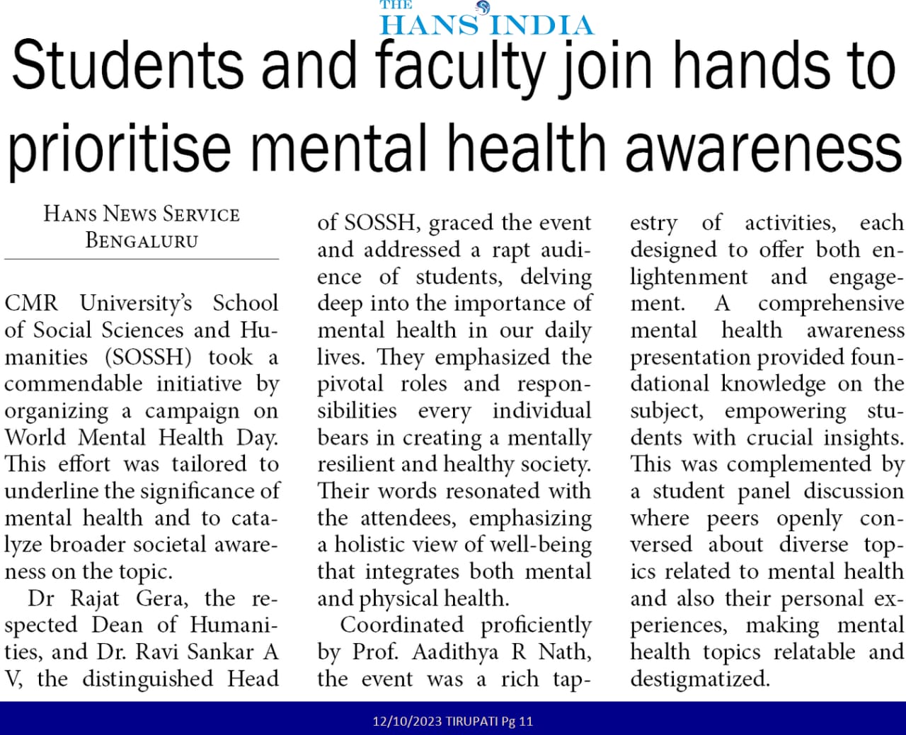 Humanities Students and Faculty Unite at CMR University to Prioritize Mental Health Awareness