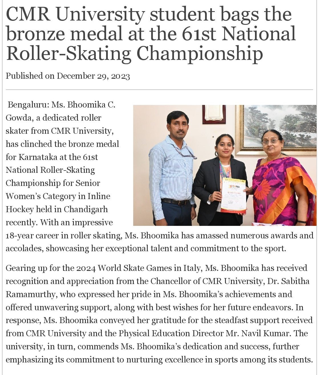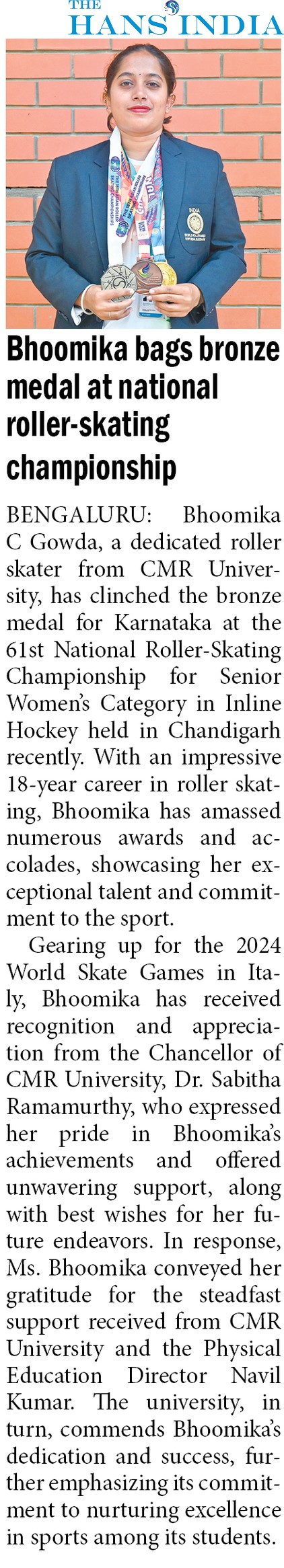CMR University student bags the bronze medal at the 61st national roller-skating championship