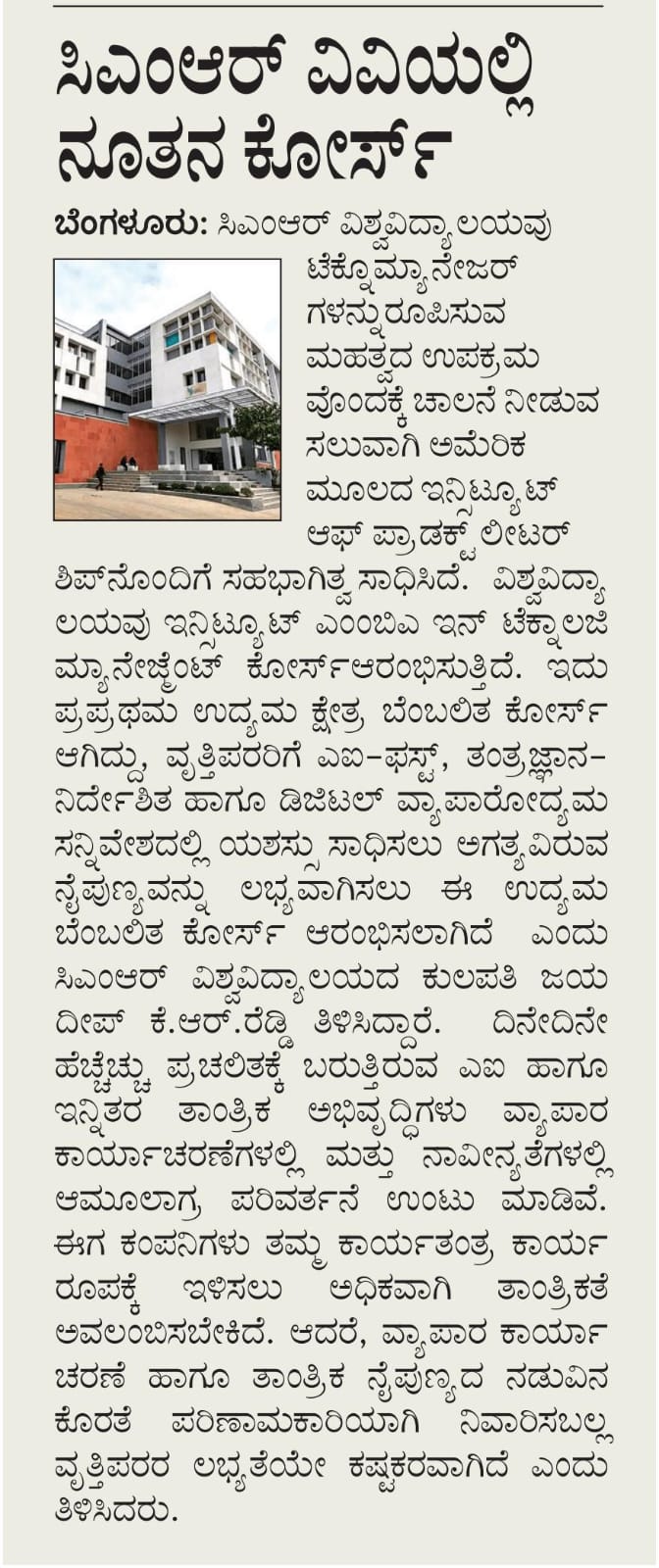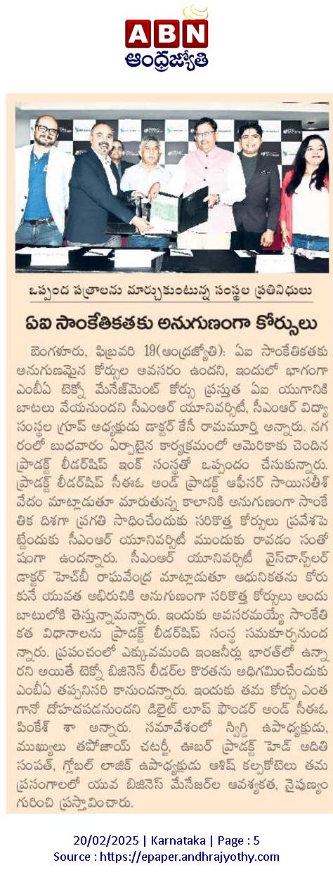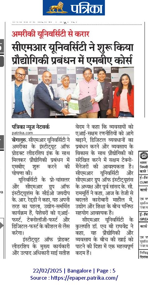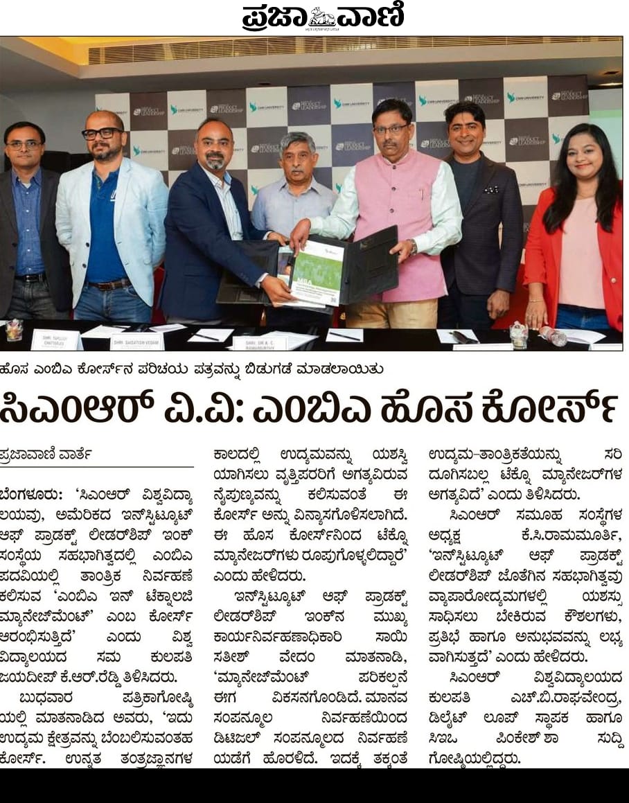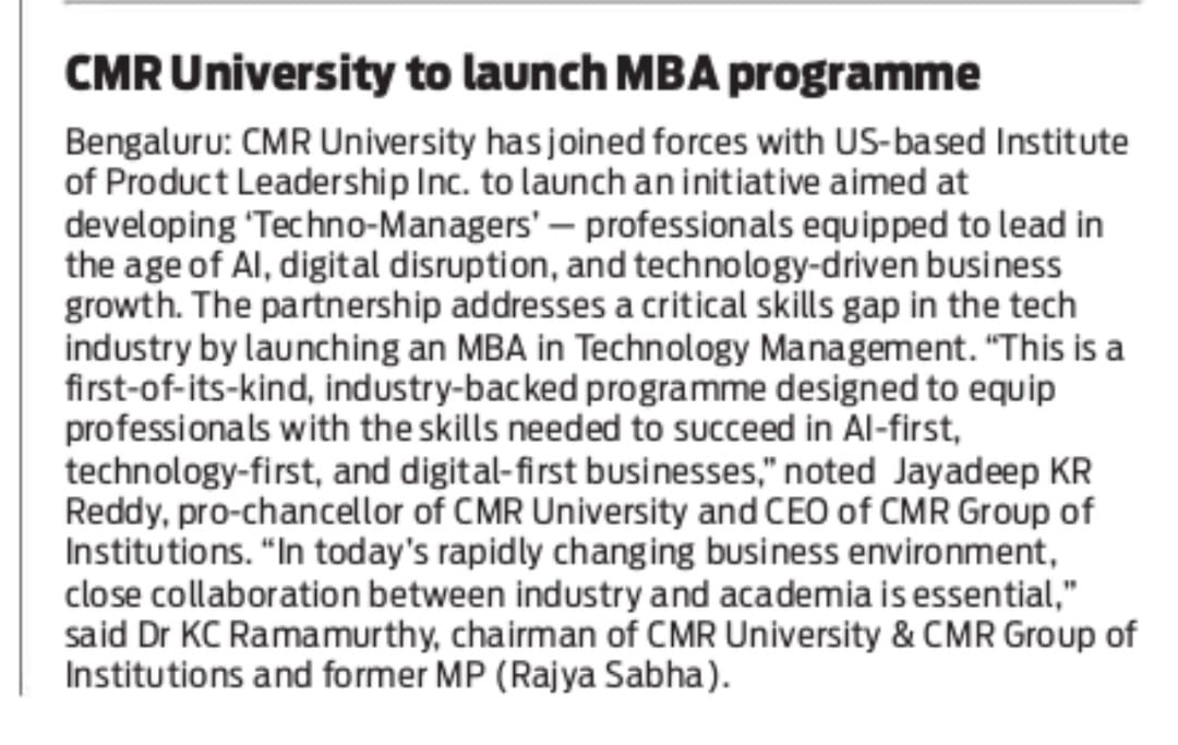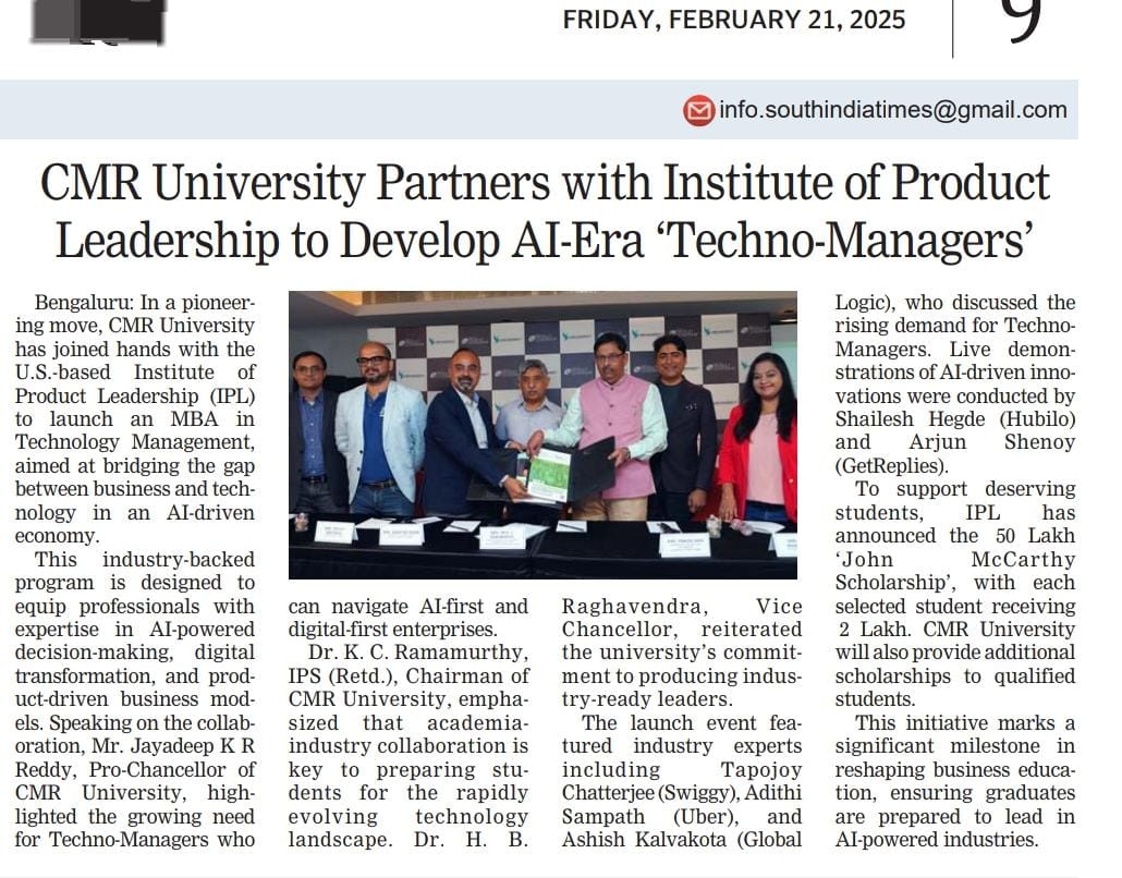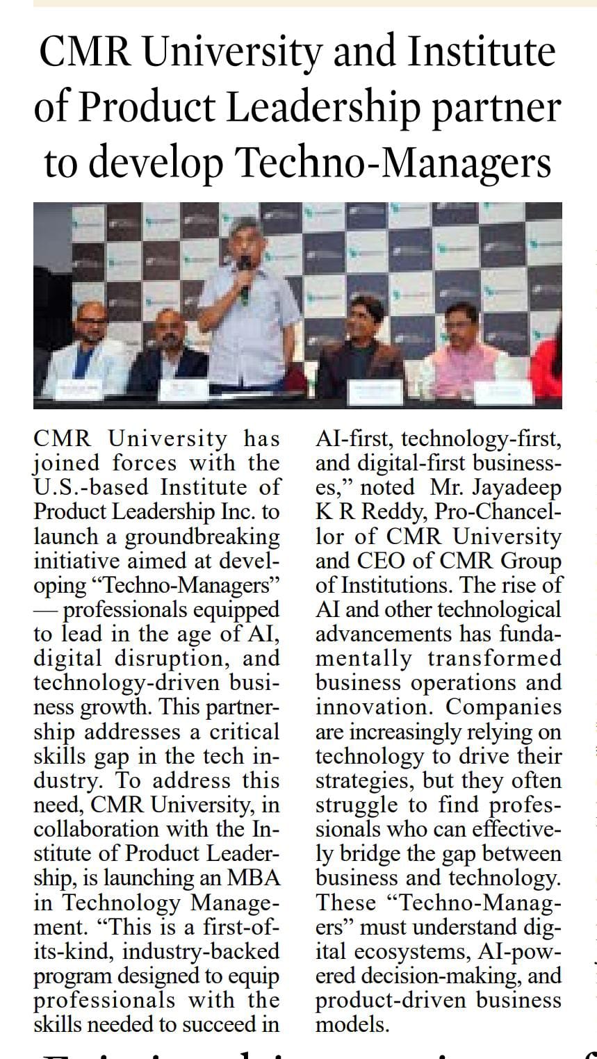 CMR University in collaboration with the Institute of Product Leadership, launches an MBA in Technology Management.