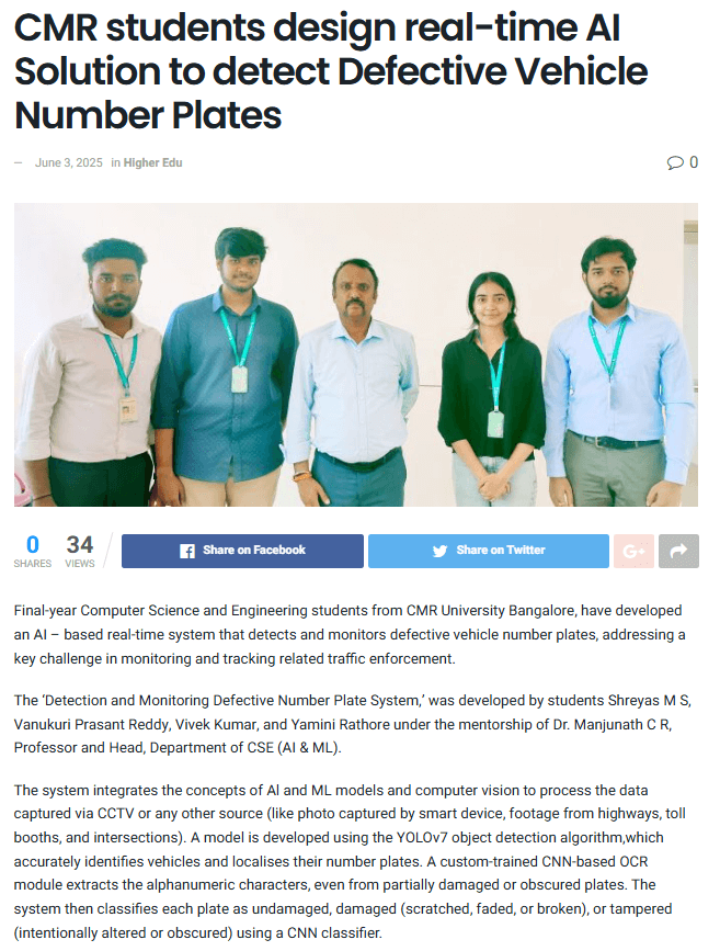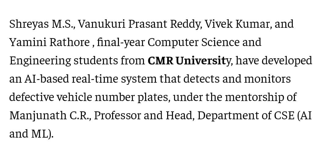 CMRU students design real-time AI Solution to detect Defective Vehicle Number Plates