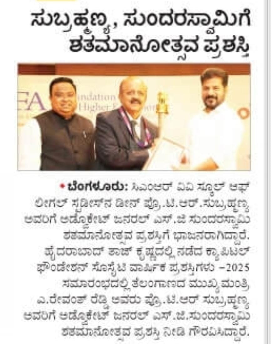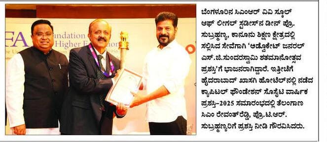 Telangana CM Presents Prestigious S.G. Sundaraswamy Award to Prof. (Dr.) T. R. Subramanya for his Contributions to Legal Education